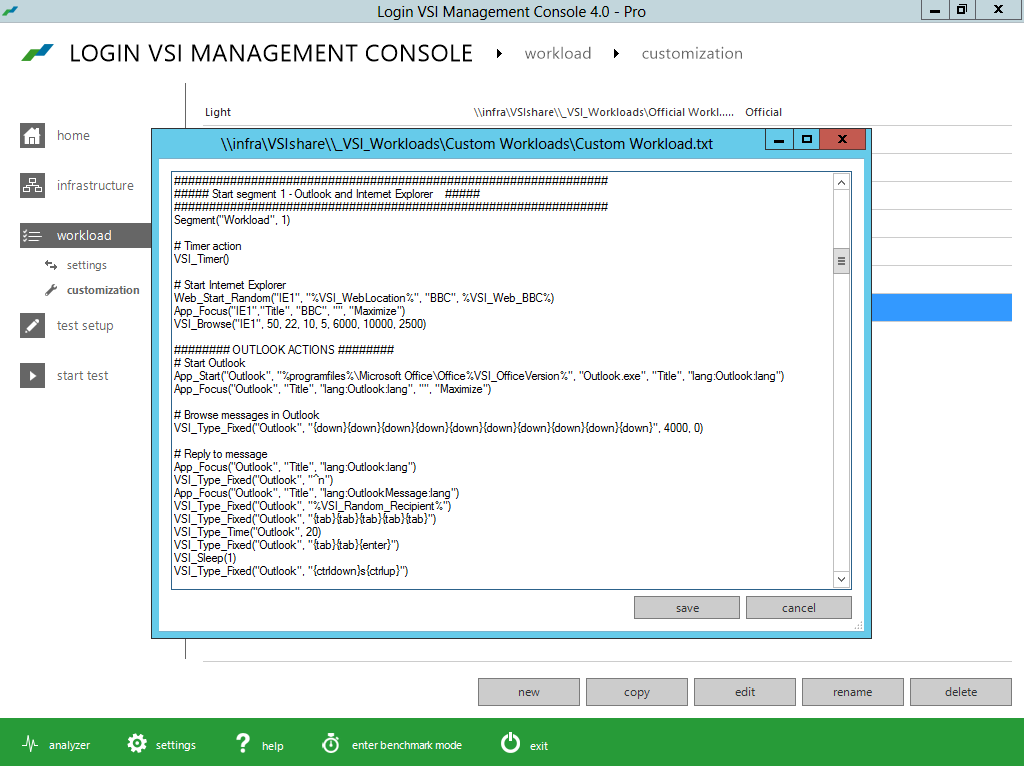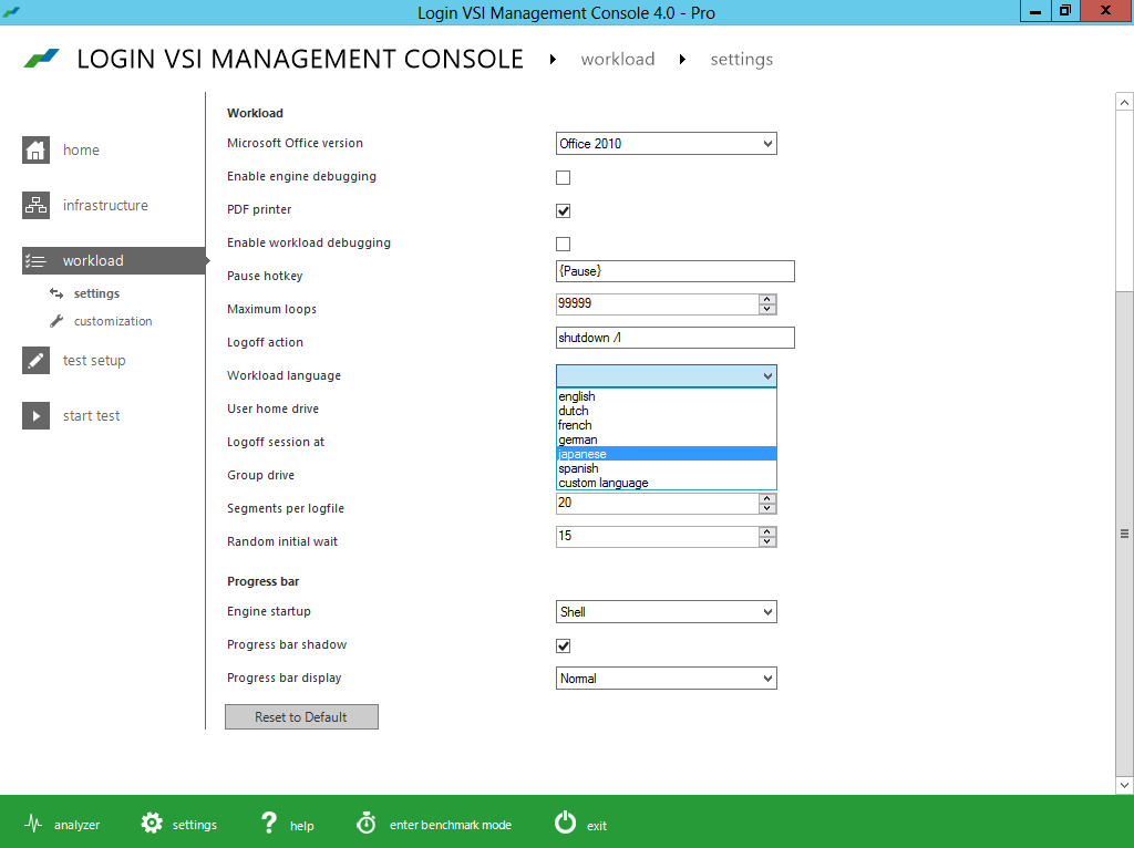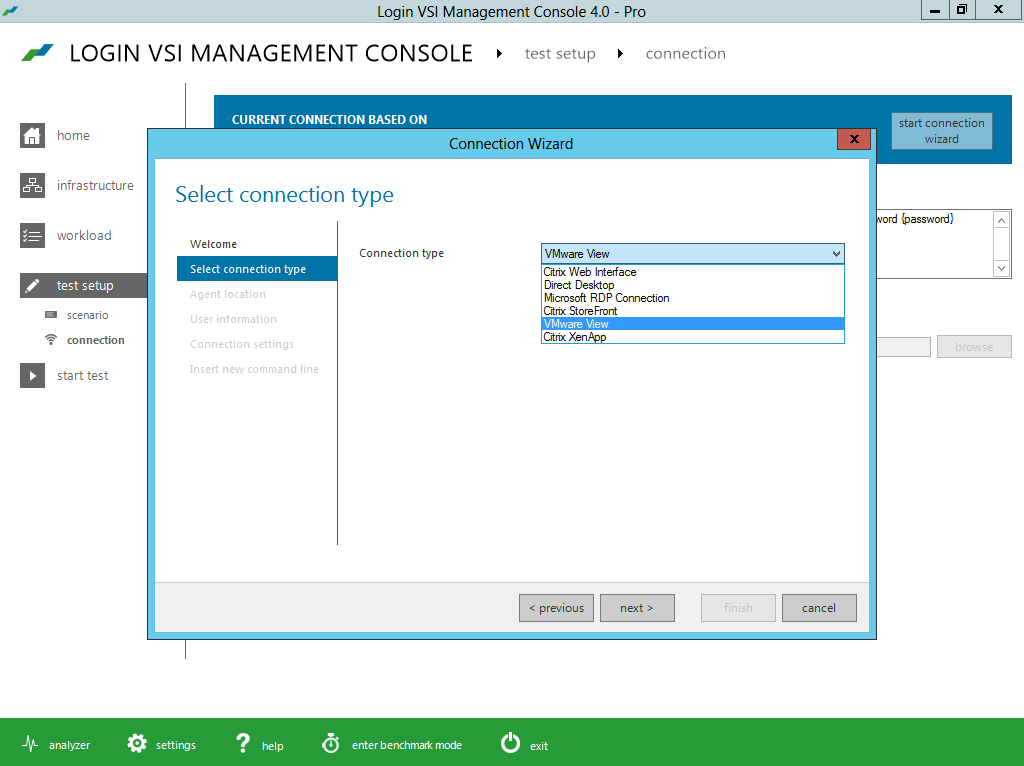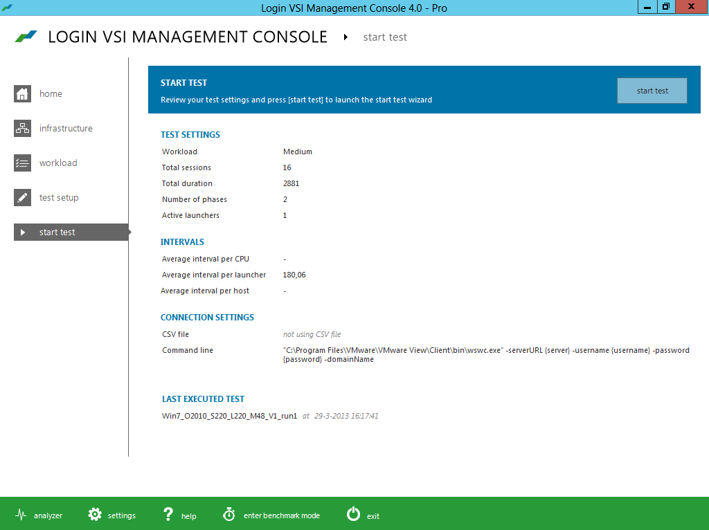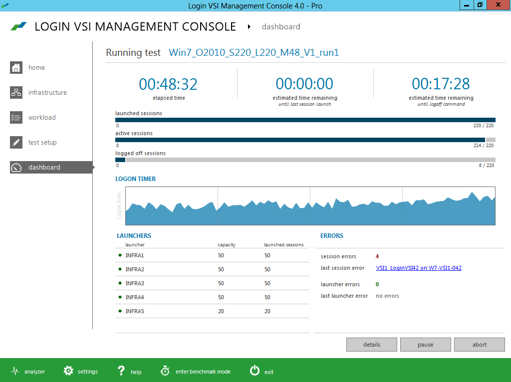 The new intuitive and workflow oriented user interface of Login VSI 4.0 offers step-by-step test creation and wizard based test configuration for all important brokers and languages. The new workload editor introduces a new meta language which makes the customization of workloads very transparent and efficient. The new benchmarking mode enforces strict testing standards, providing industry standard results that are objective, comparable and repeatable.