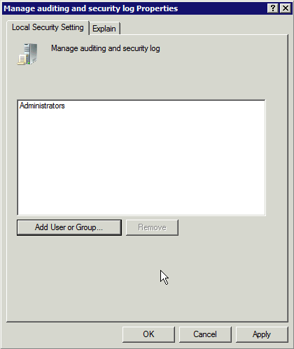 A couple of resource “out there” says that this could be because the account you logged in with doesn’t have permissions to “Manage auditing and security log properties”, but this I have: