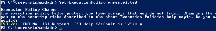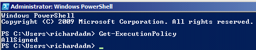 I once again checked the NTFS permission on the folder highlighted in the event Id, but those where fine. I definitly have permissions to it… but perhaps the PowerShell script cannot do it for some reason which I assume is called to configure the stores etc from the GUI. So lets’ check the execution policy of PowerShell, it’s set to: