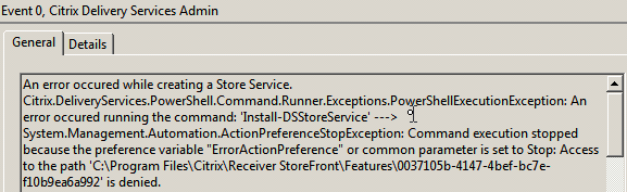 This doesn’t seem stable.. should have installed SF 2.0 on a separate server a looong time ago and would have been done by now! š And it failed again to create the Store… hmm.. complaining again about permissions to C:\Program Files\Citrix\Receiver StoreFront and subfolder… now gave EVERYONE Full Controll to it and all subfolders and files ( I know this is NOT something U want to do, but for this test I’m just not keen on finding out the exact permissions required, it worked with SF 1.2 on this same box a couple of HOURS ago!). Logged of and back on to get a new token and let’s see what happens now!