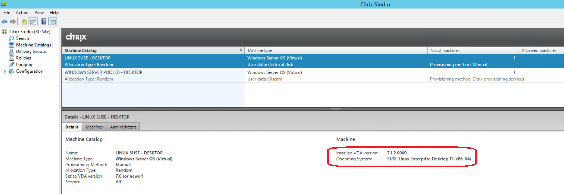 If we go over to Citrix Studio and have a look you can here see the Machine Catalog for this Linux VDA: